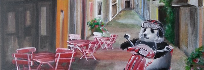 This painting is part of a series where a panda travels his way around the world. Follow our panda friend through the streets of France on his blazing red moped.