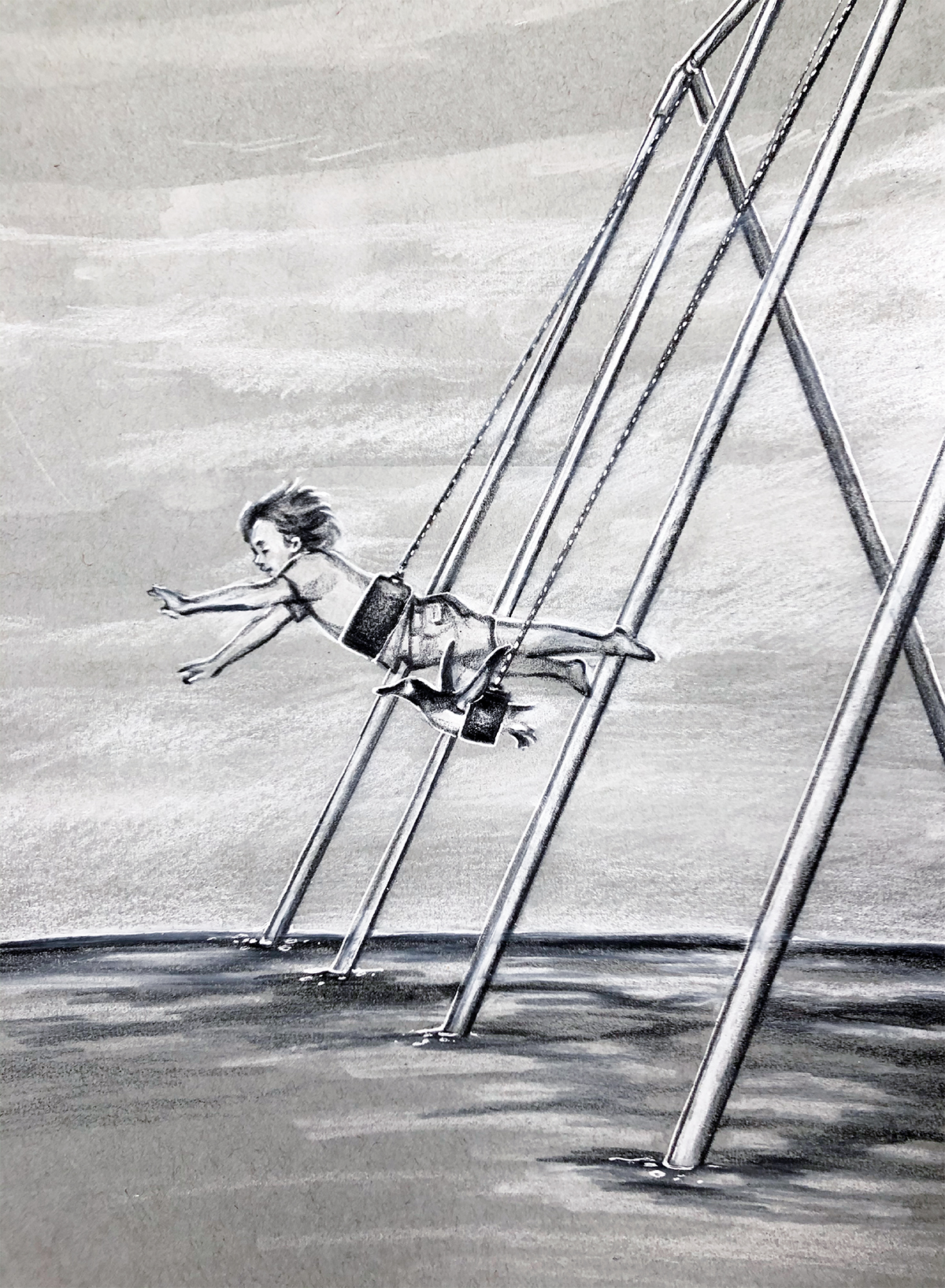 Gouache, oil pencil and archival ink on mix media grey toned paper