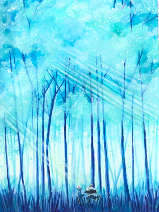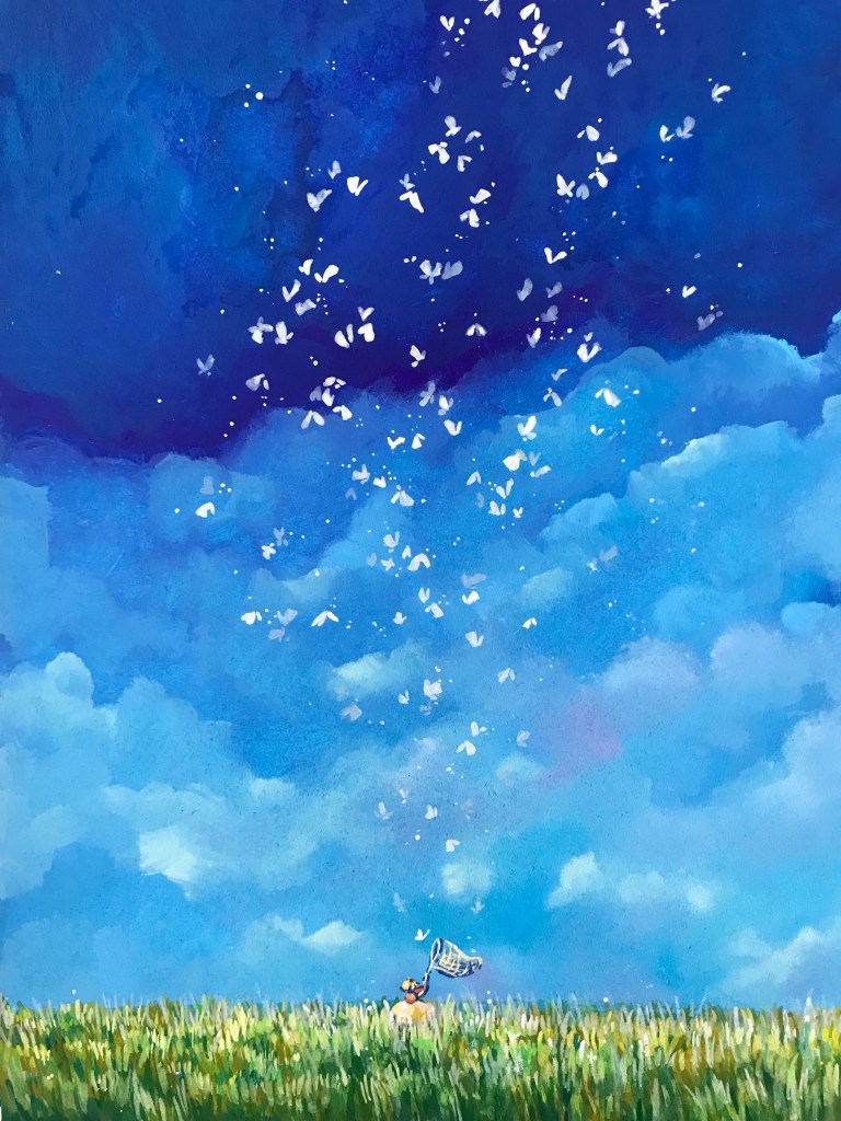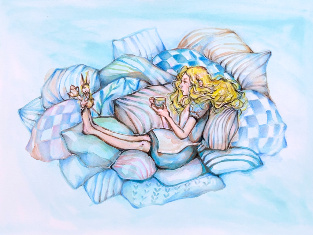 To me, the white rabbit in the story means following unlikely clues and finding ourselves in the middle of an extraordinary situation. These situation often challenges our beliefs and changes our life. This painting is inspired by the idea of finding time to sit with ones’ thoughts and ideas – to rediscover ourselves.