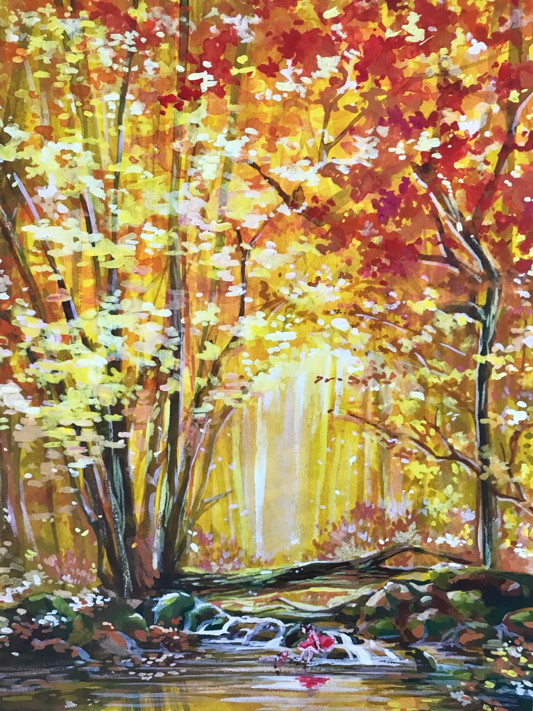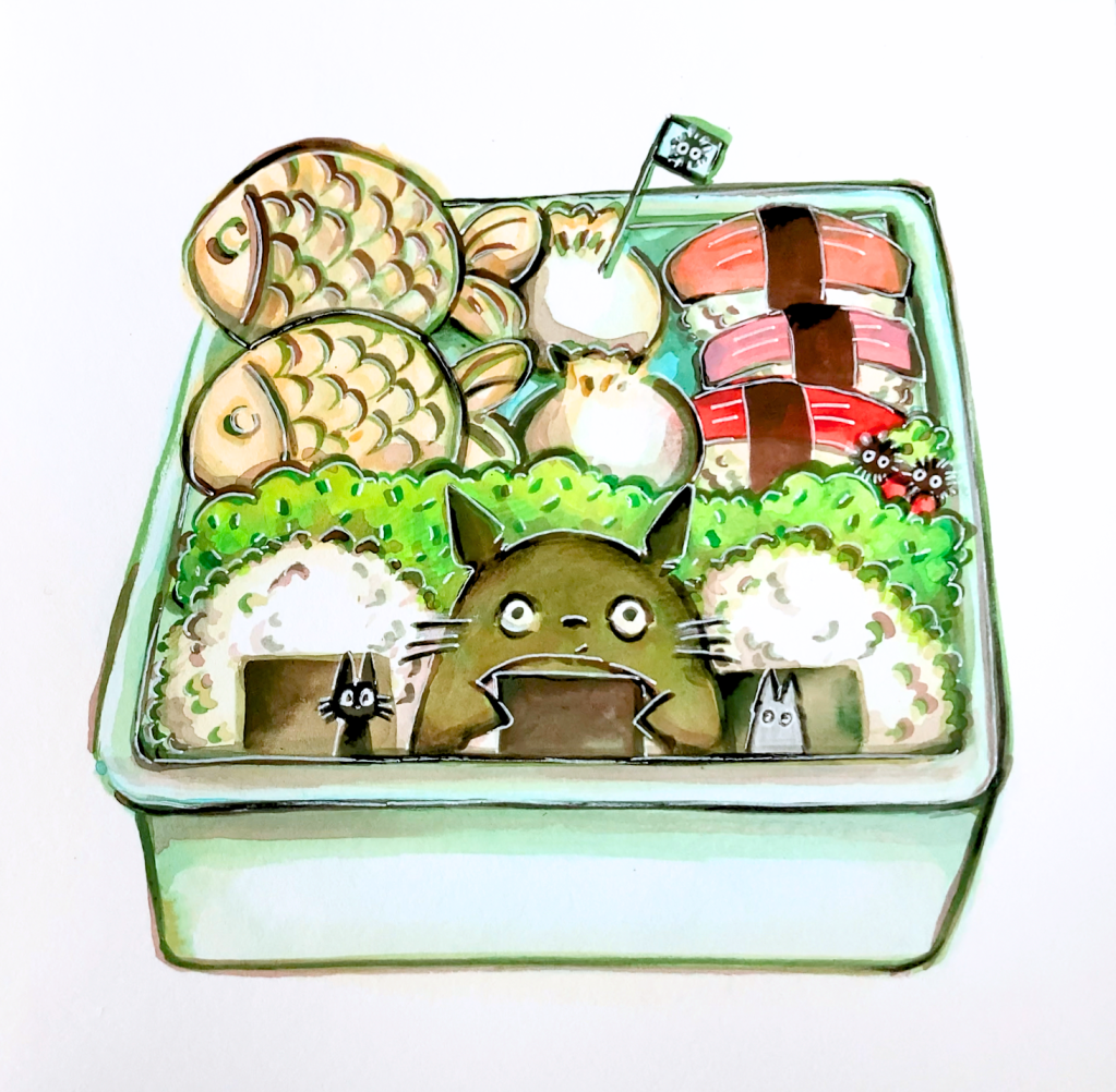 This piece is inspired by Studio Ghibli’s Totoro. You will see a number of other characters from the various Studio Ghibli movies sprinkled throughout this bento box. This was such a fun piece to paint ! Full time lapse can be found on my YouTube channel.