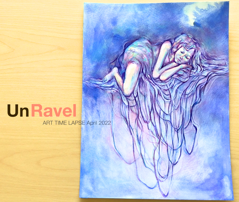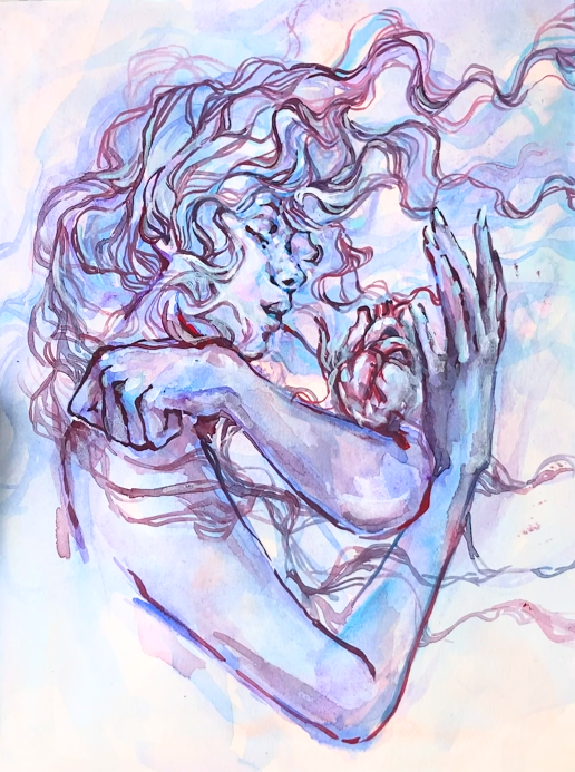 For this painting, I wanted different patterns for the fabric draping from the two characters- they represent the different passages through time.
