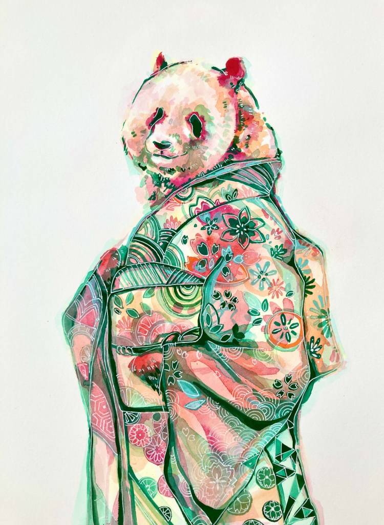 Every year, I do a new rendition painting of an animal in a tradition kimono. This is a tradition that was originally started many years ago when I first started painting with gouache. It brings me back to the beginning and reminds me of where I come from.