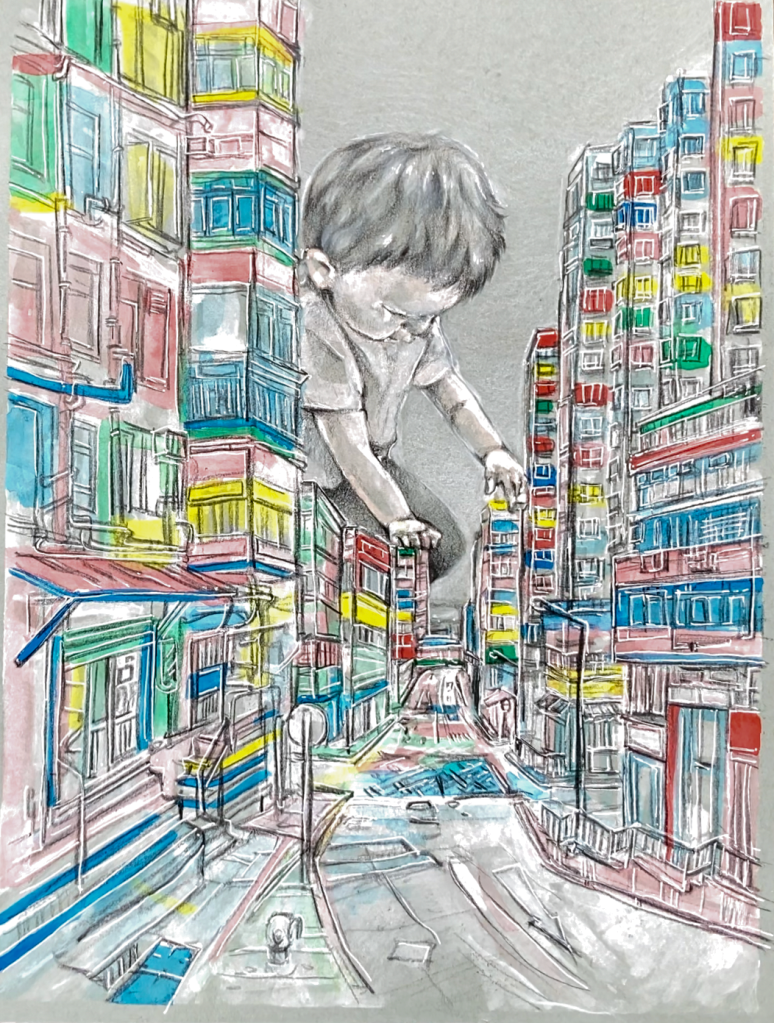 For this piece, I decided to use the primary colours to outline the buildings- to illuminate the idea of how these structures are similar to a child’s building blocks.