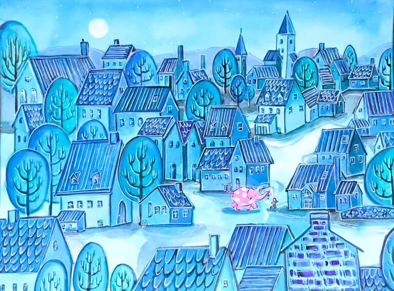 Let your imagination go wild . Imagining an evening stroll through the town with a pink polka dotted elephant.