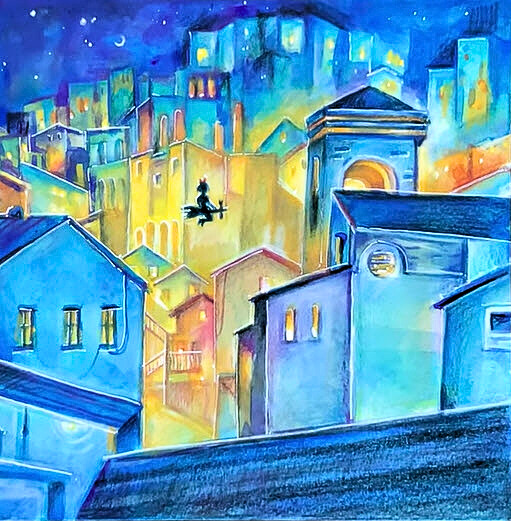 Do you recognize the character flying on her broomstick through the city? Being at awe by the glowing city in th night?