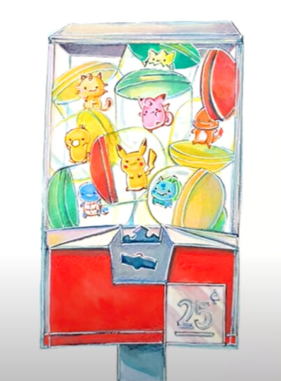 I love the playful idea of the forest spirits lining up for the Susuwatari vending machine, while Totoro watches on from the side bench.