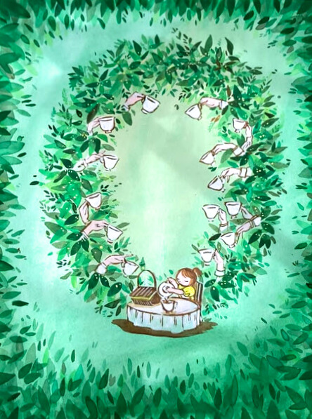 A playful piece inspired by Studio Ghibli’s Totoro, featuring the Catbus, Mei and the Soot Sprites.