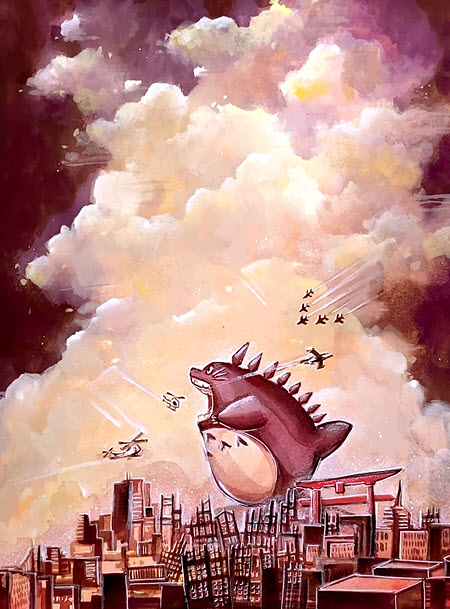 This piece is a fan art inspired by Studio Ghibli’s My Neighbor Totoro and the classic Godzilla.
