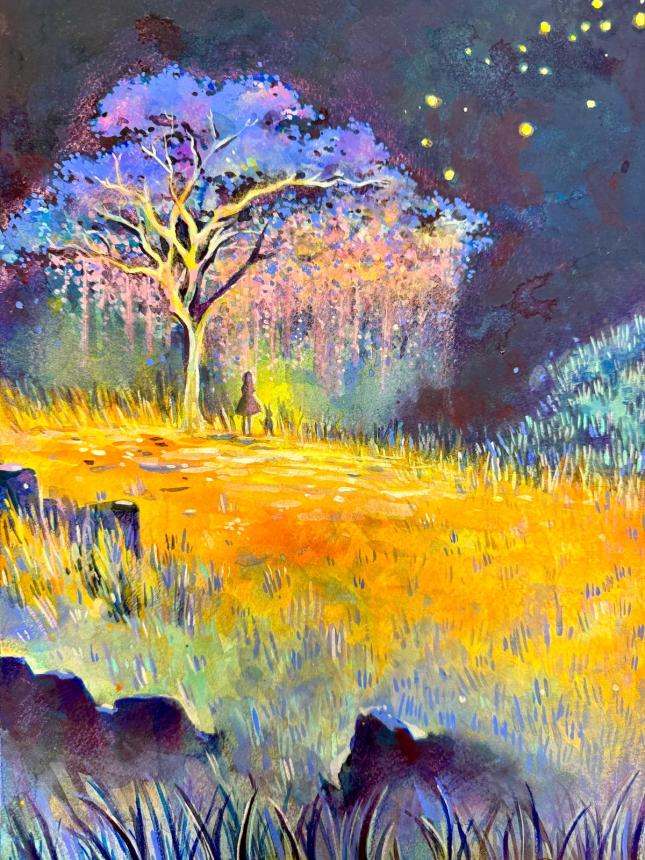 In the darkest night, there is still a hint of glow in the living and the wonderous nature that surrounds us. Under the umbrella of the glowing foliage, a rabbit and a girl stand in the still night- admiring the still night.