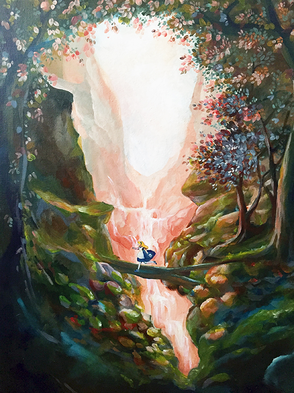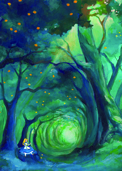 Go discover your adventure on your own time, not on someone else’s schedule. I tried to highlight this theme by having Alice holding her own pocket watch, instead of having her chase after a rabbit checking on his own time on his watch.