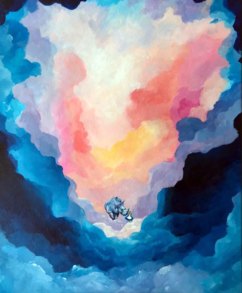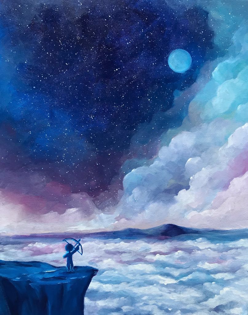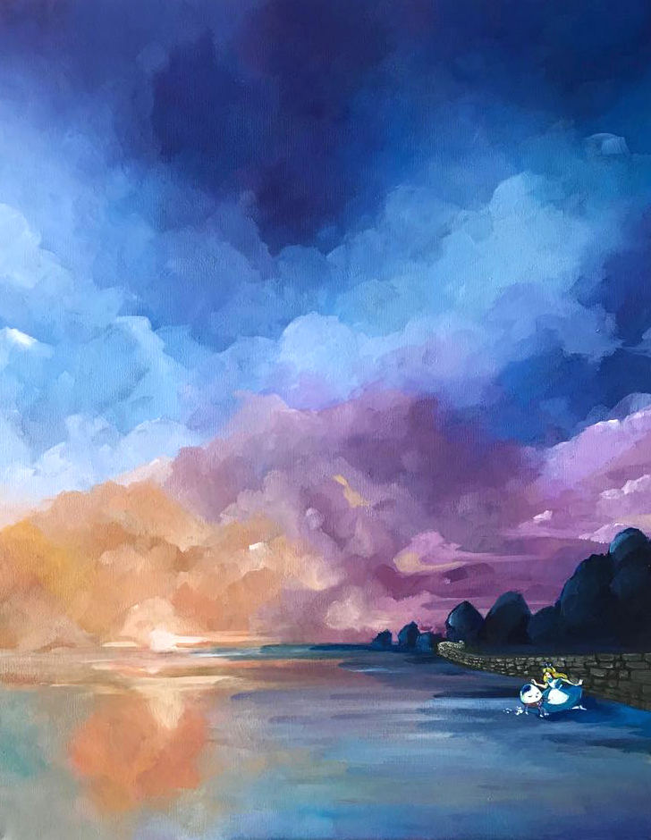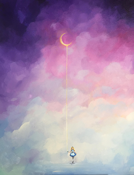 ‘Moonshine’. Just had this idea for a painting late in the evening and couldn’t stop painting until I got everything down on canvas . With each brush stroke, the idea for the painting flowed out so naturally. The dreamy colours of the fluffy clouds came out just as I had expected. It’s a delicate piece with Alice holding out a teacup to fill out on some magical moonshine. It’s an Alice in Wonderland inspired piece with a twist on the tea party theme.
