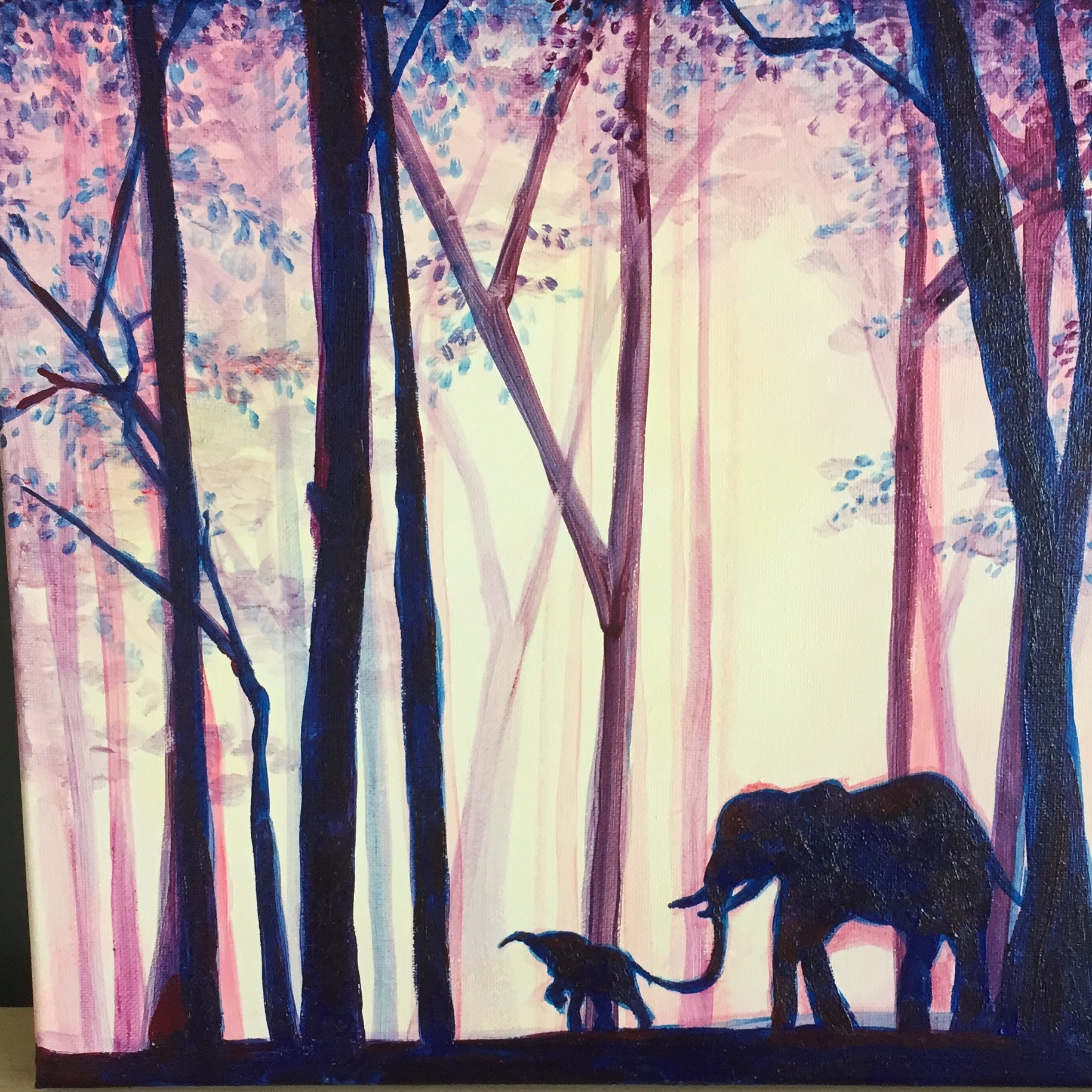 I’ve always loved elephants , but it’s been awhile since I last painted one. Here is an momma elephant taking a stroll through the forest with her baby. You can see the baby elephant walking playfully through the forest early the morning. Her momma is walking behind, never far behind.