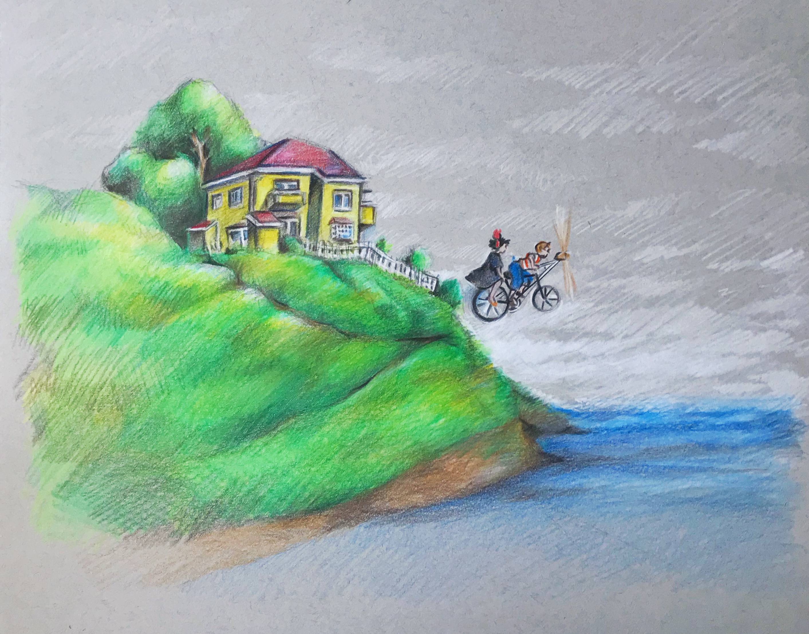 This illustration is based on the fan theory that the baker and his pregnant wife, from Kiki’s Delivery Service, are actually the grown up versions of Ponyo and the little boy. This is why I’ve sketched Kiki making a special delivery to Ponyo’s old house.